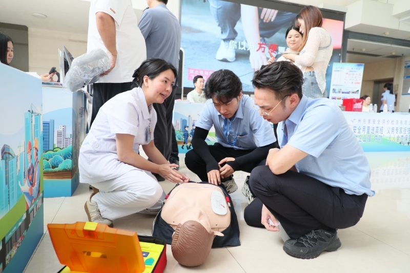 黄埔区卫生健康局带来以急救知识为内容的生命安全小课堂。救援人员跪在患者身旁,双手交叠按压胸口,清晰演示心肺复苏术,同时教授AED使用方法,围观市民纷纷举起手机认真记录。几步之外,黄埔区司法局以“民法典相伴”主题开展普法,该区海事部门详细讲解溺水急救技巧,黄埔区城市管理和综合执法局则聚焦燃气安全,现场展示如何规范处置泄漏险情。